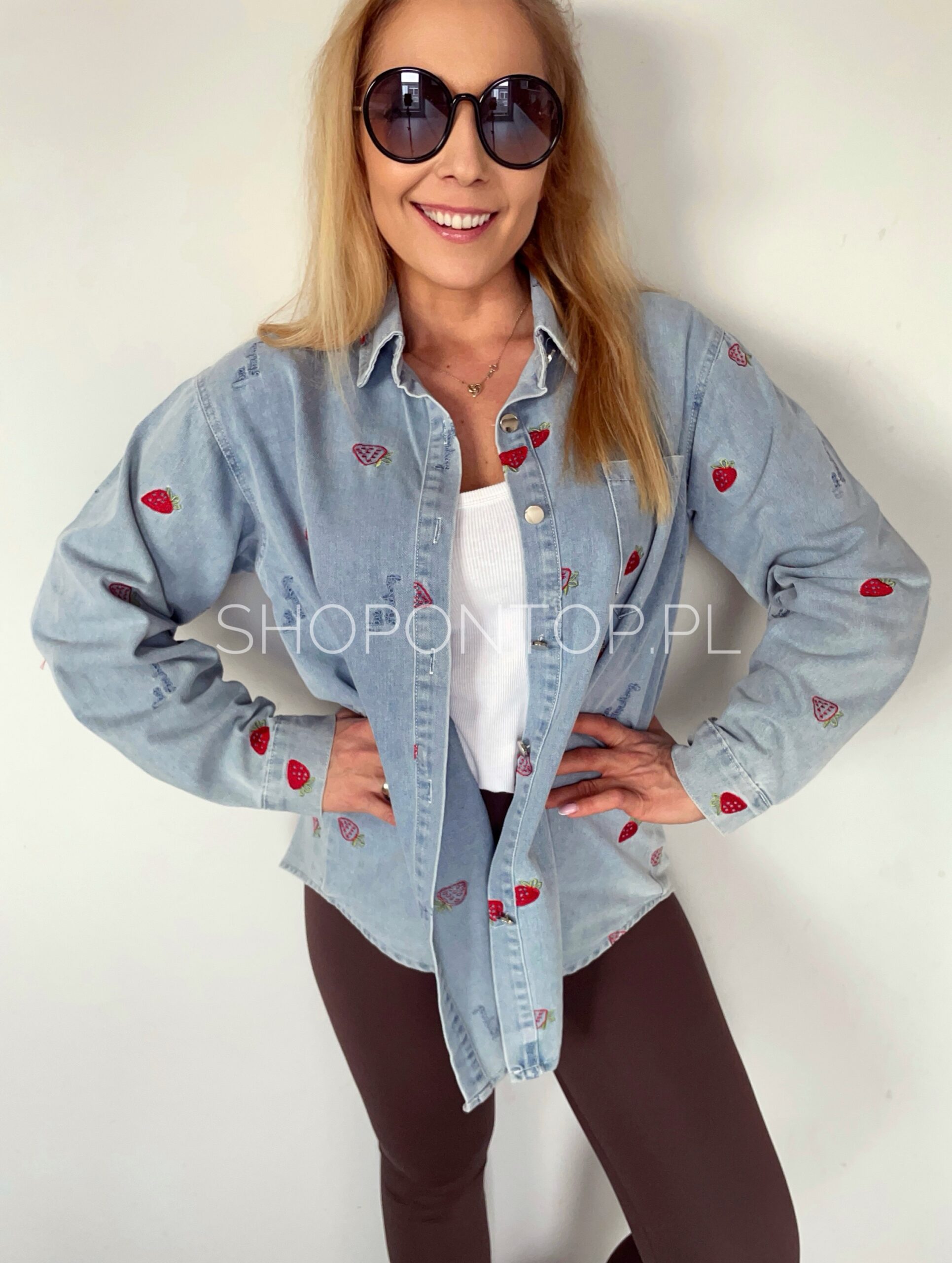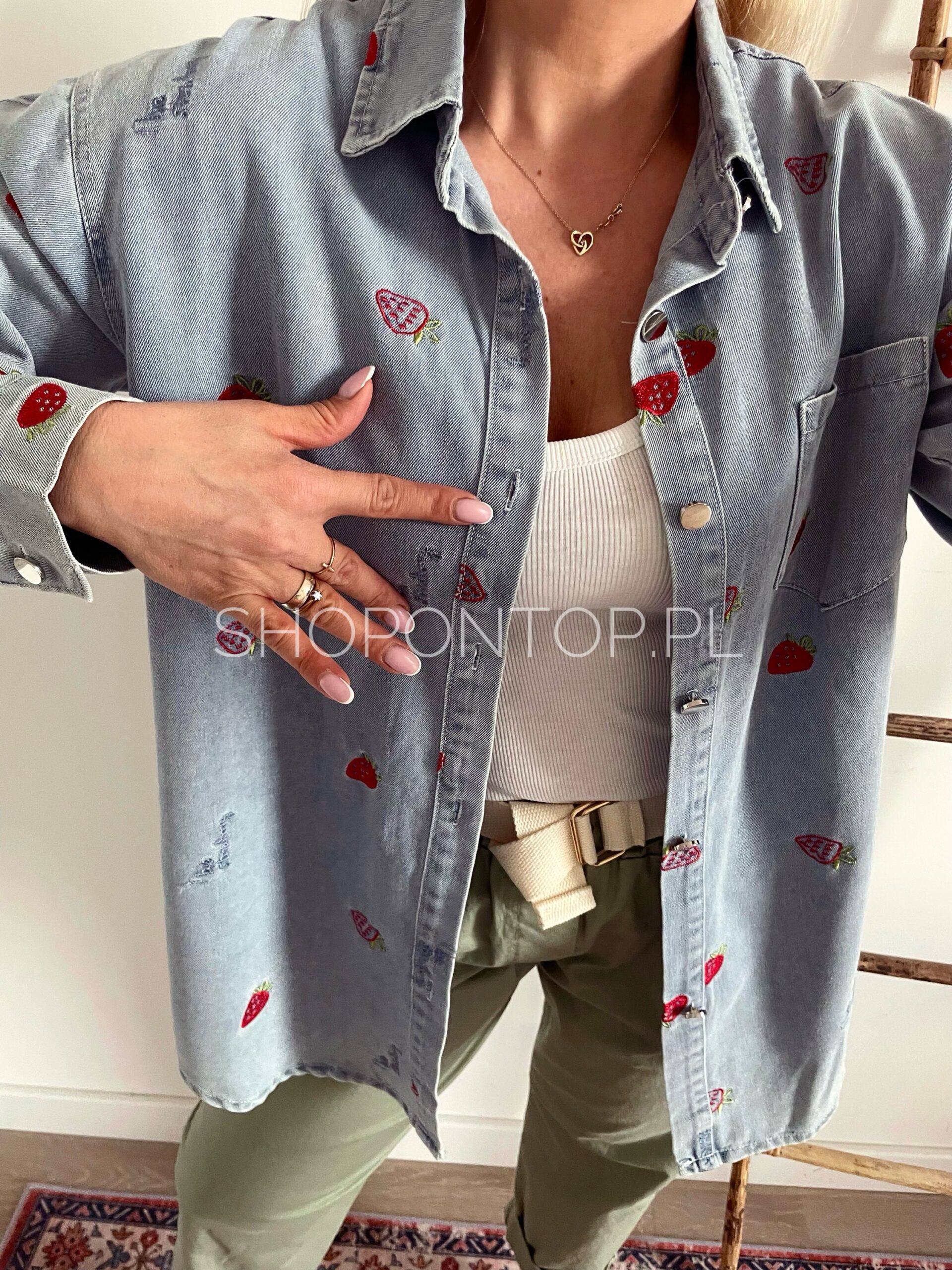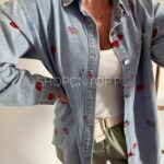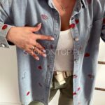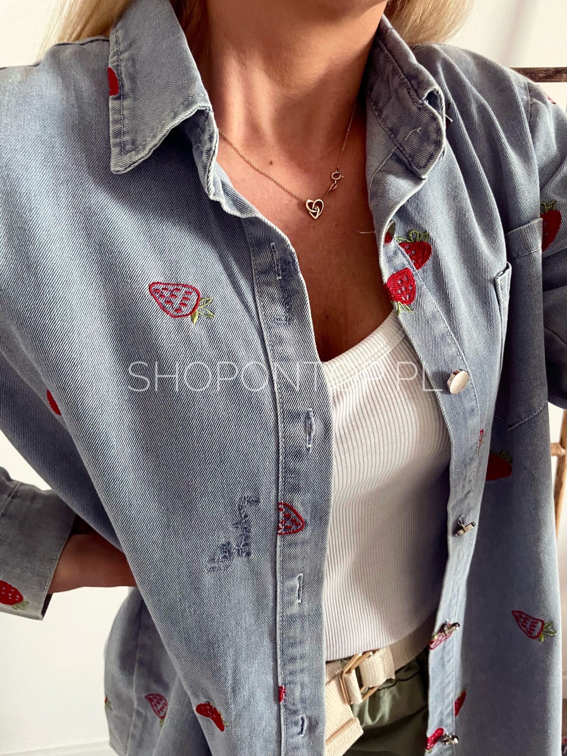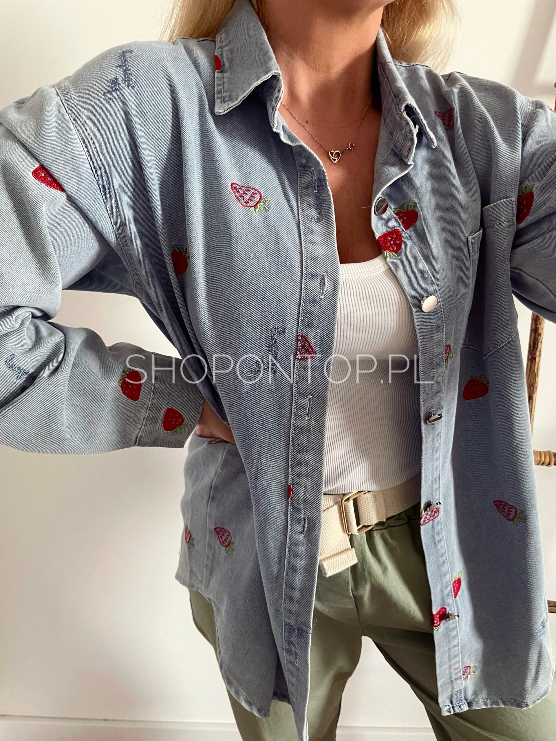 Rewelacyjna jeansowa koszula w urocze truskawki.