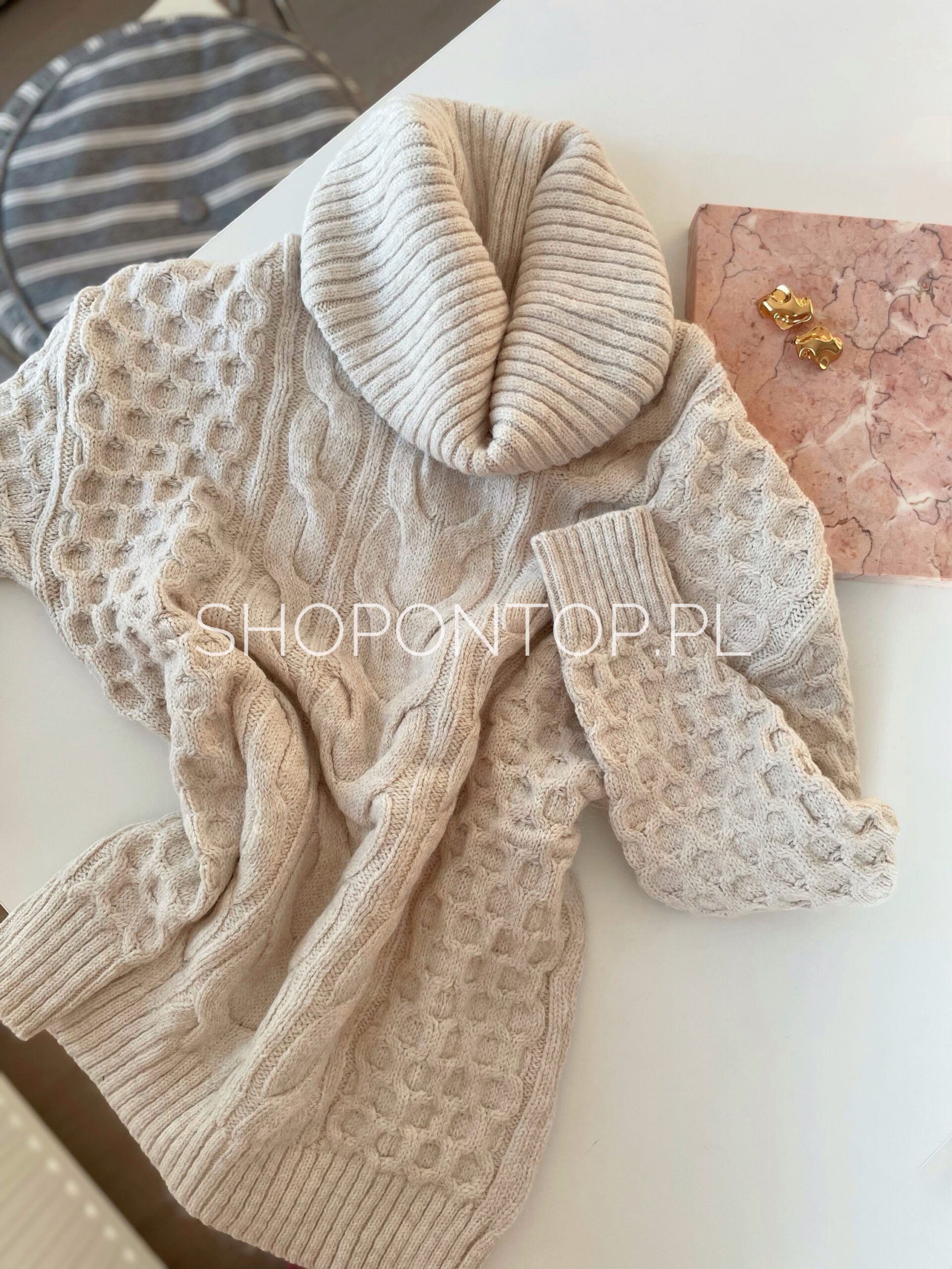 Piękny sweter z luźnym golfem w jasnym odcieniu beżu.